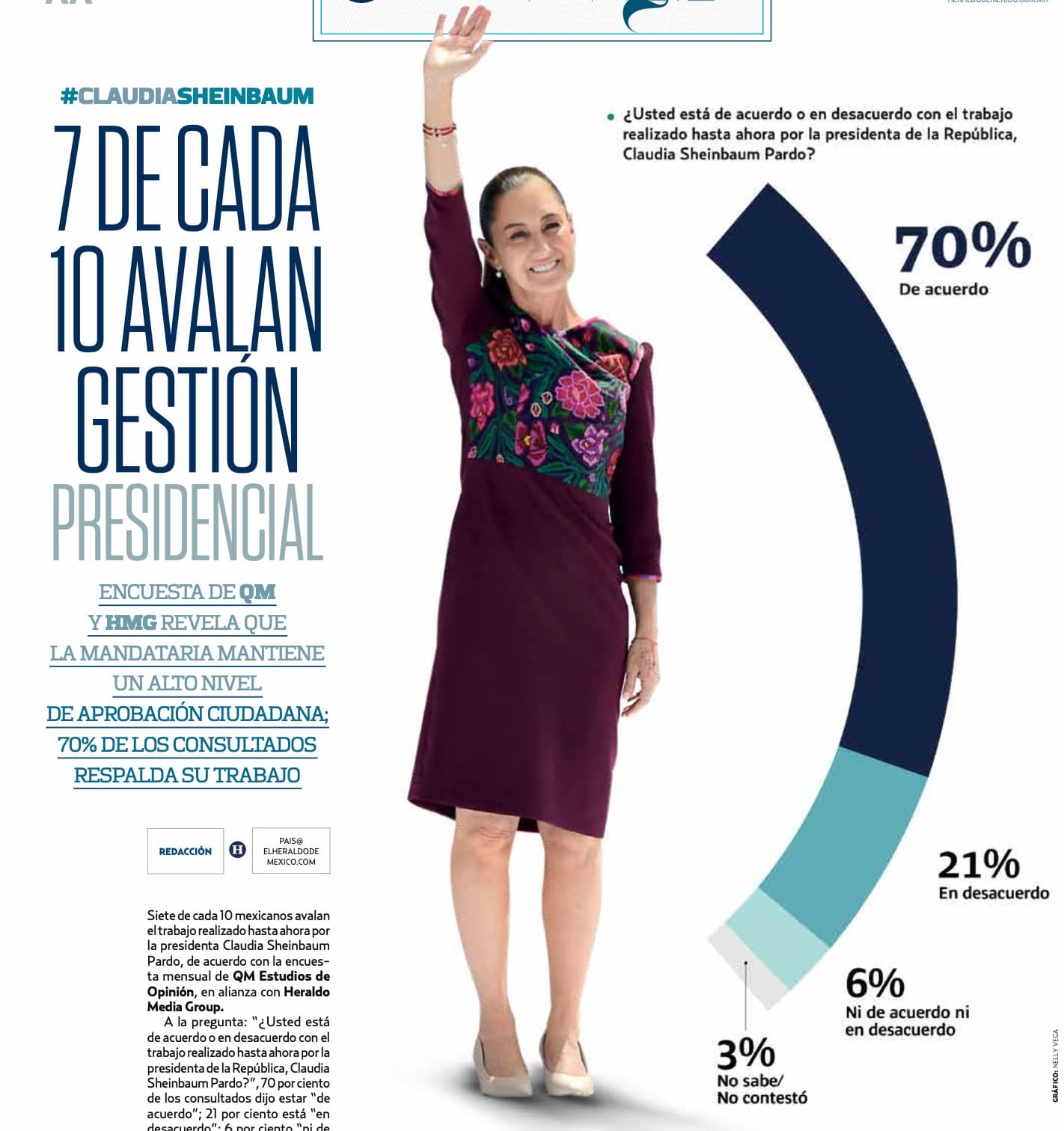 La presidenta Claudia Sheinbaum Pardo informó que su nivel de aprobación se mantiene en 70 por ciento, de acuerdo con un ejercicio de opinión elaborado por QM Estudios de Opinión en conjunto con Heraldo Media Group.