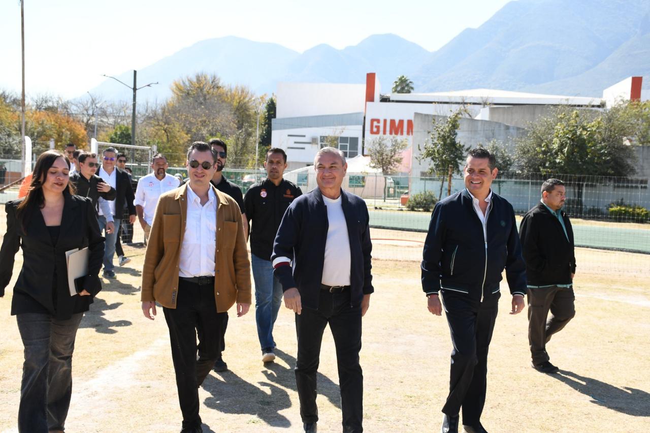 El senador Luis Donaldo Colosio, el alcalde Héctor García y el director de la Fábrica de Escuelas, Luis Fernando Dominguez Martin del Campo, supervisaron hoy el inicio de las obras de construcción de lo que será la cancha número 420 realizada por el programa de infraestructura educativa y deportiva 2021-2027.