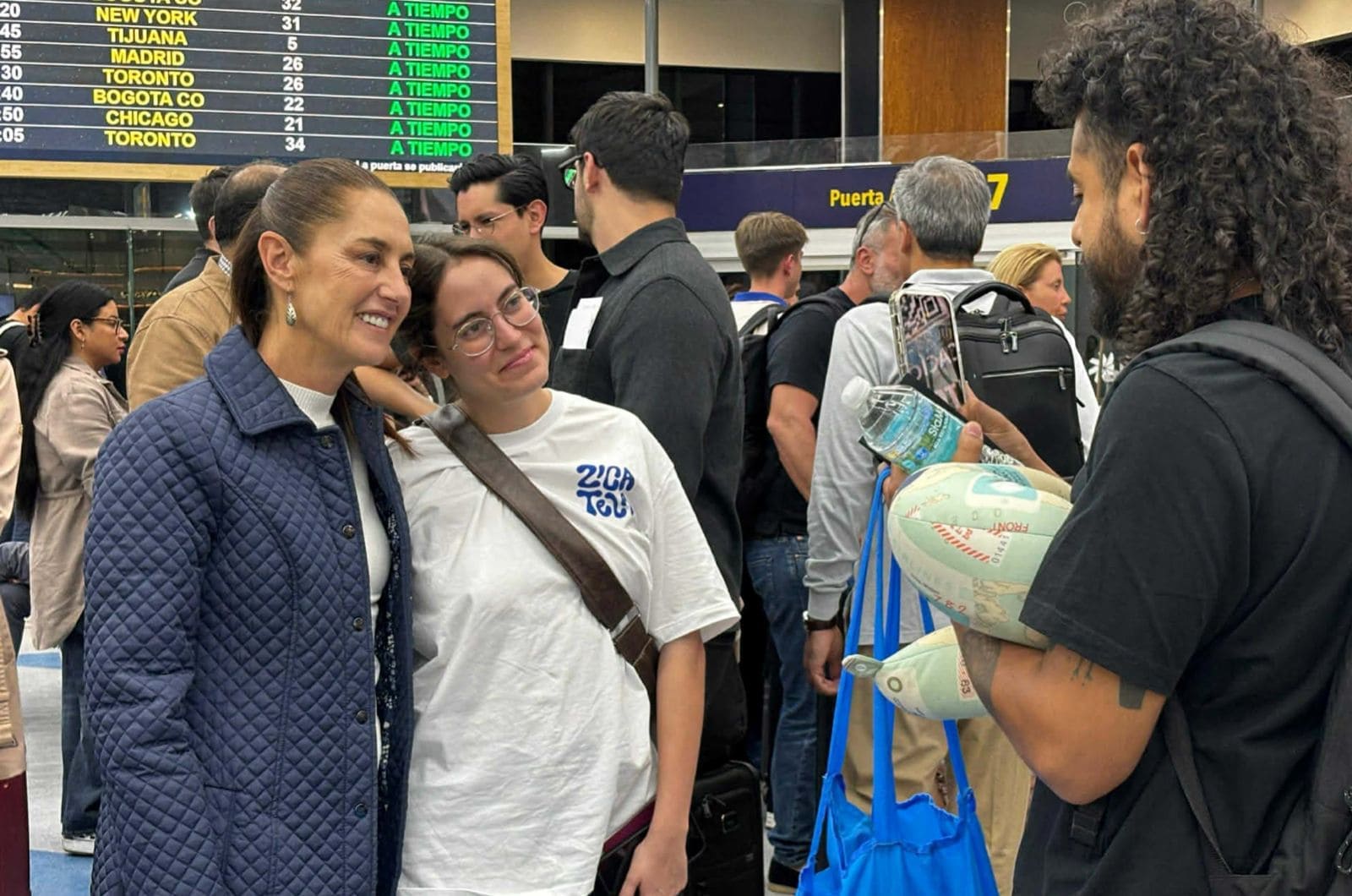 Su presencia en el Aeropuerto Adolfo Suárez Madrid-Barajas generó atención entre viajeros, quienes se acercaron para saludarla. Videos en redes sociales muestran a personas que solicitaron fotografías y entablaron breves conversaciones con la mandataria.